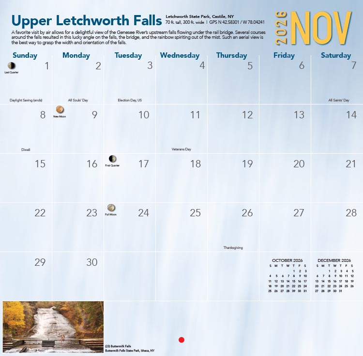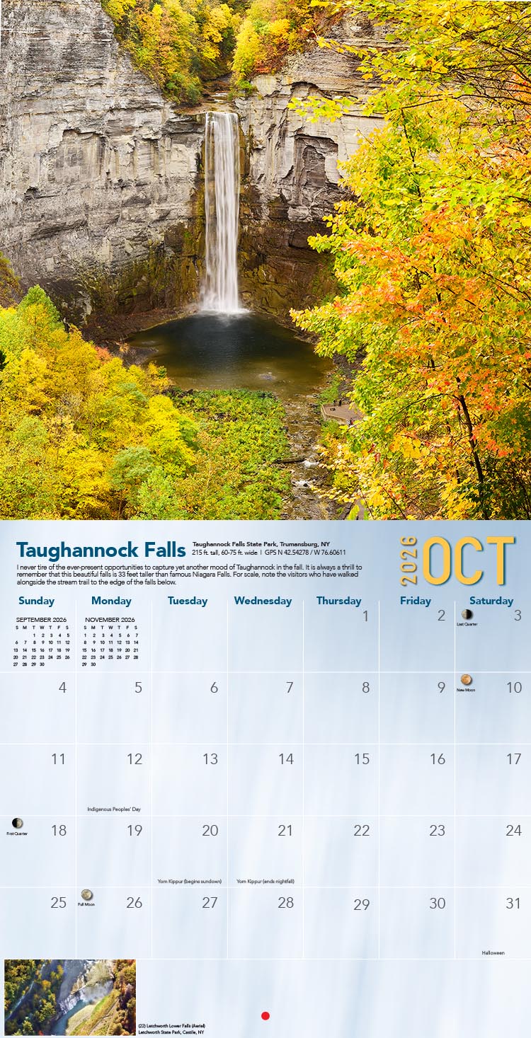 When displayed on your wall, the calendar is 12” x 24” containing 12 twelve-inch award-winning waterfall photographs, 24 extra grid photos, and a removable Center-Poster of Taughannock Falls. The binding is saddle stitched, stiffened, and shrink-wrapped.